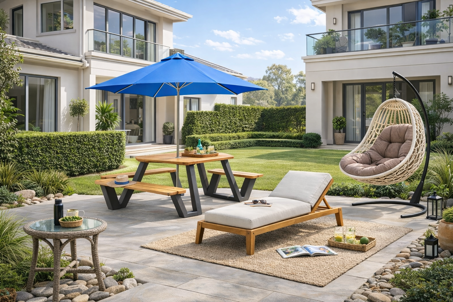 Explore hanging chairs, sun loungers, picnic tables with umbrellas, and round outdoor tables – stylish, durable, and perfect for garden, patio, or backyard.